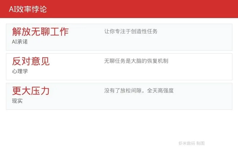 每一个使用过AI工具的知识工作者都有这样的体验:AI确实帮你省去了很多繁琐的工作——整理格式、汇总数据、起草例行文档。但你省下来的时间去哪了?它并没有变成你的休息时间——它被填满了更多的高强度工作。你的老板看到你"效率提高了",自然就给你安排了更多需要深度思考的任务。