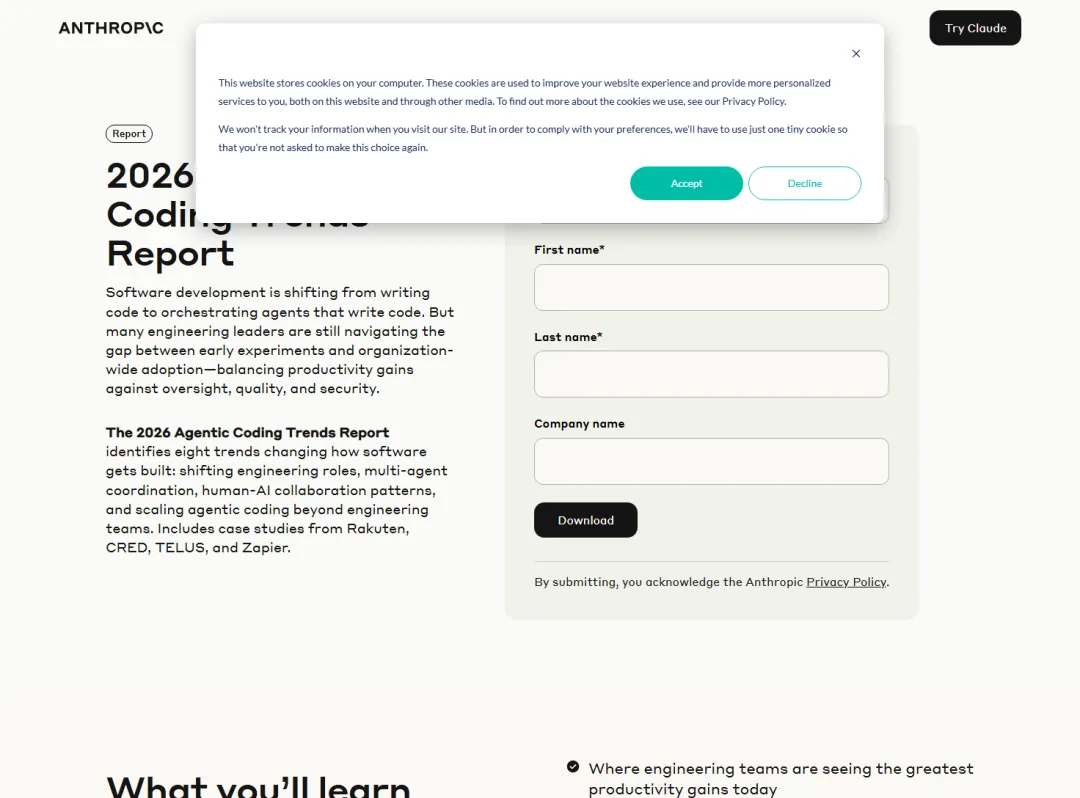 Anthropic在1月21日发了一份18页的PDF,《2026智能体编码趋势报告》(2026 Agentic Coding Trends Report)。基于和Augment Code、Fountain、乐天等企业的合作数据写成,Dario Amodei在推特上转发了。
