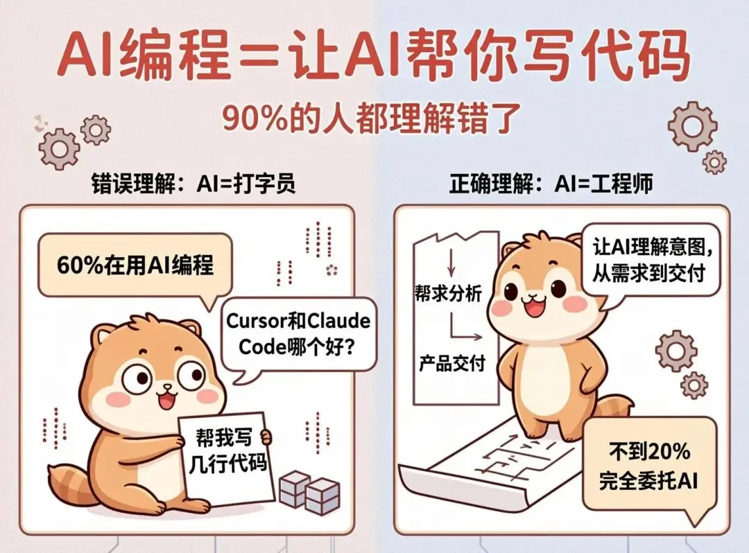 知乎上有个高赞回答大意是"AI编程=用AI帮你写代码"。我觉得这个等号不成立。AI编程要做的事情比写代码大得多——让AI理解你的意图,按照工程化的方式,从需求到交付,把活干完。你用Claude Code写了一个函数,这不叫AI编程,这叫让AI帮你写了一段代码。