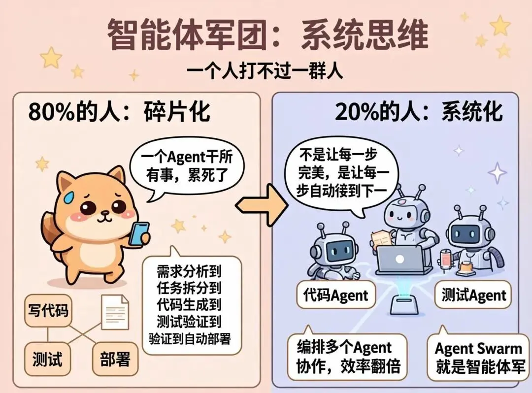 Anthropic报告里有个概念叫"智能体军团"(Agent Armies),不是让一个AI帮你干活,是编排多个AI Agent协作完成一件事。我观察了群里300多个学员的实际使用情况,有几个做法区别很明显。