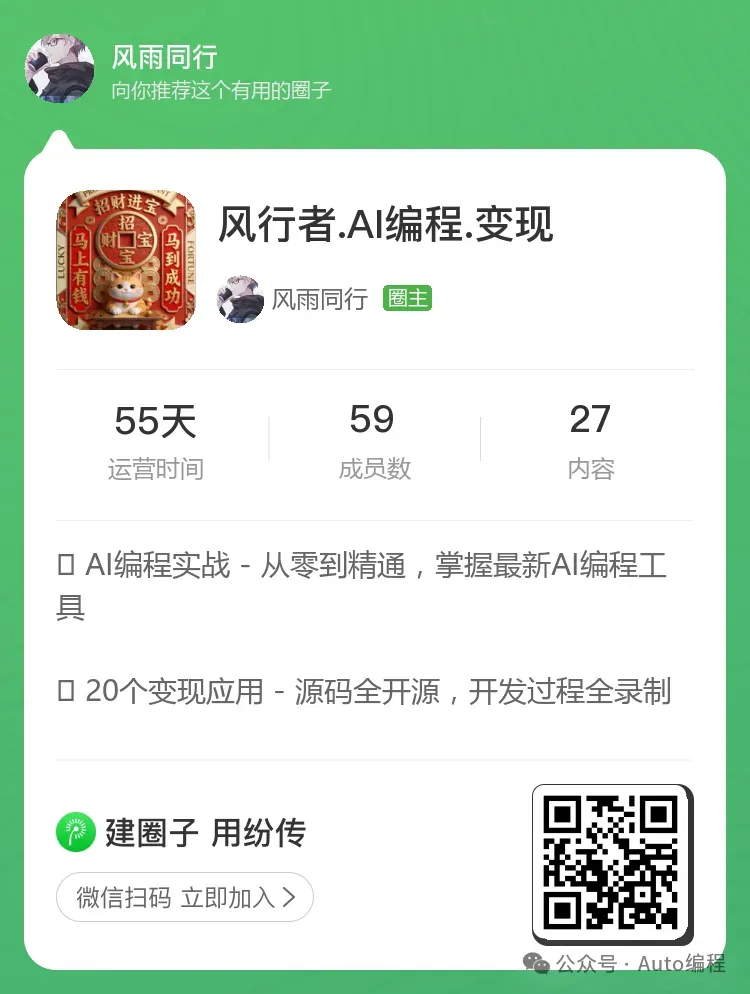 我花了3个月摸索的这套方法整理进了AI全能班,4期300多个学员从贵州铜仁到北京上海都在用。纷传圈子"风行者.AI编程.变现"59个成员,每天讨论AI编程实战问题。不绑定任何工具——工具会过时,方法不会。