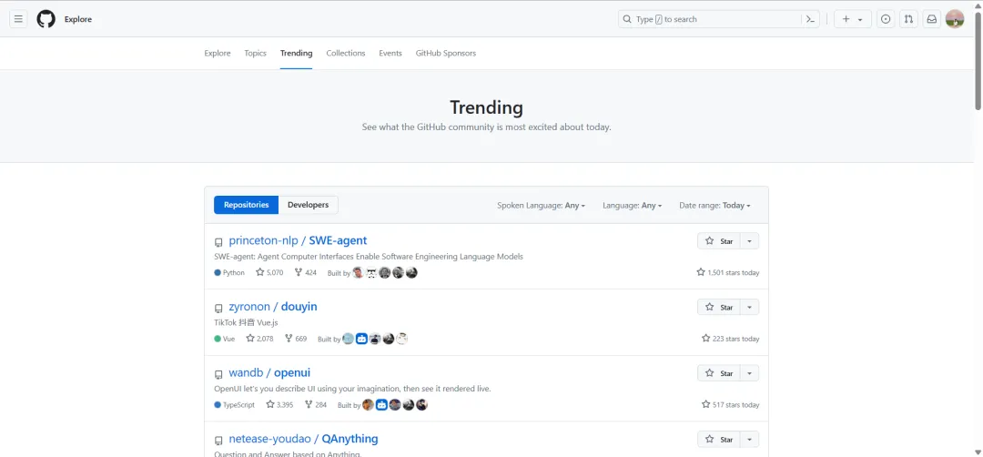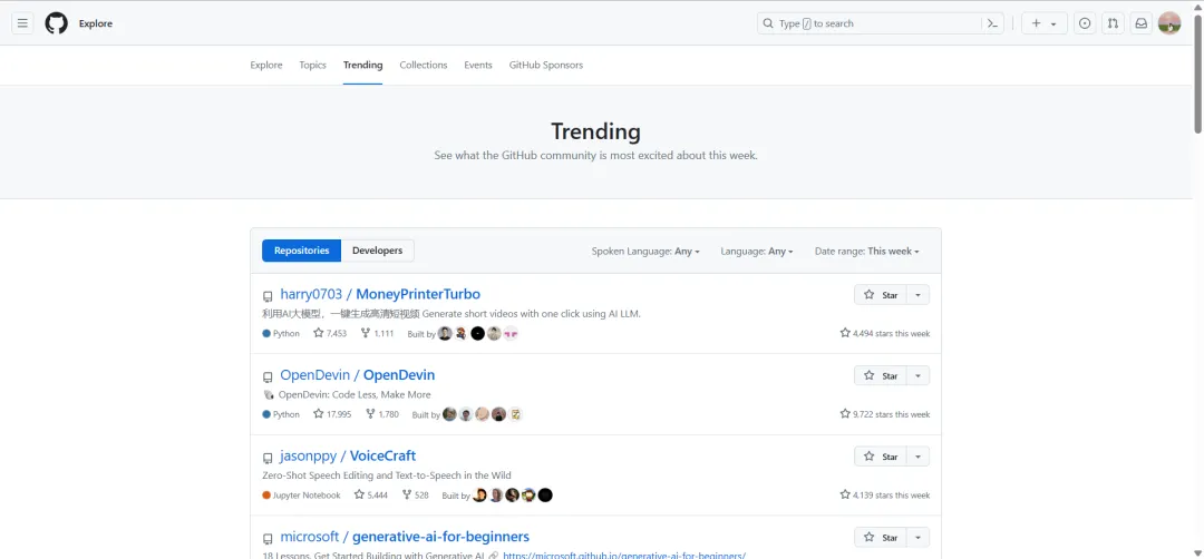 一个程序员必看的网站。该网页展示了当今GitHub社区最感兴趣的仓库,包括编程语言、工具、库等。