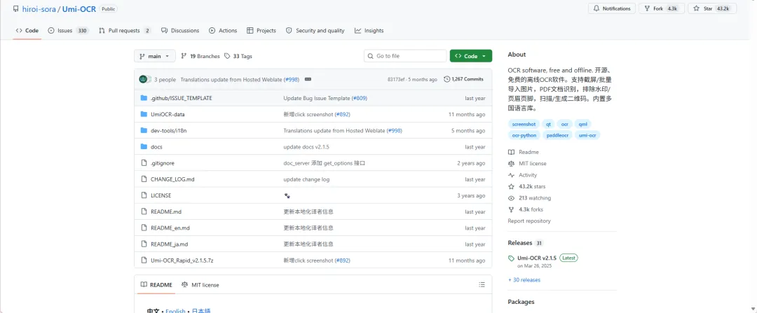 GitHub上43.2K Star,支持截屏/批量导入图片,PDF文档识别,排除水印/页眉页脚,扫描/生成二维码。内置多国语言库。目前更新至2.1.1版本,解压即用,离线运行,无需网络。支持命令行、HTTP接口等外部调用方式。