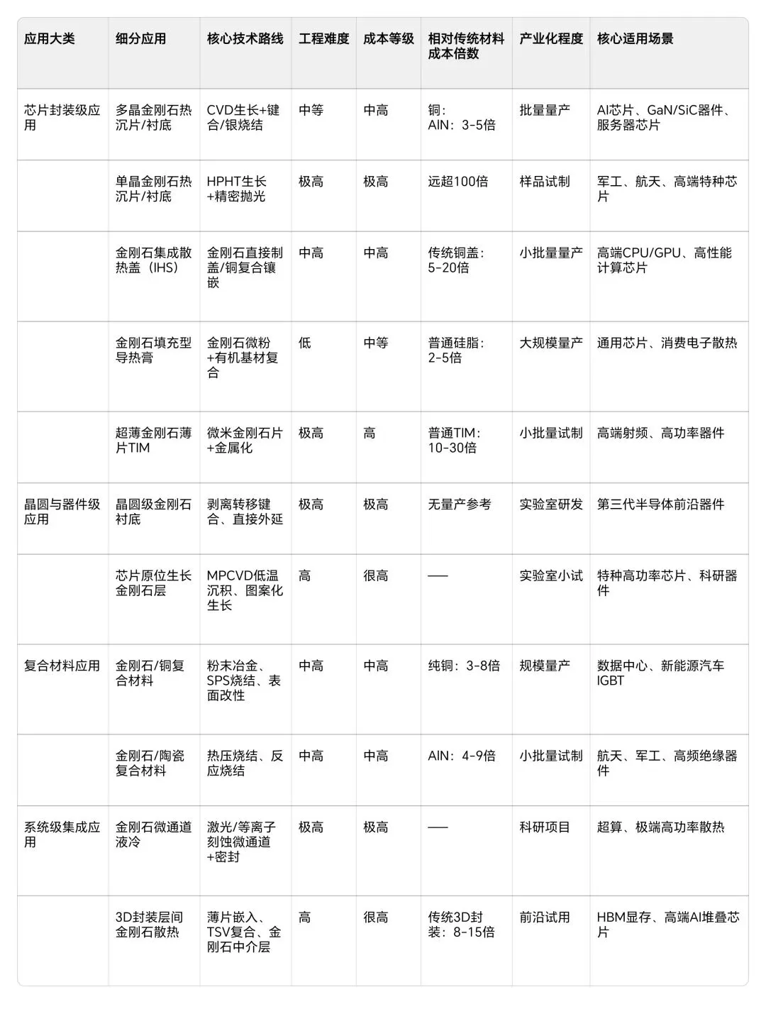金刚石在芯片散热领域的应用,并非单一方案,而是形成了从封装级到系统级、从成熟量产到前沿研发的完整布局,技术落地节奏清晰、差异化明显。