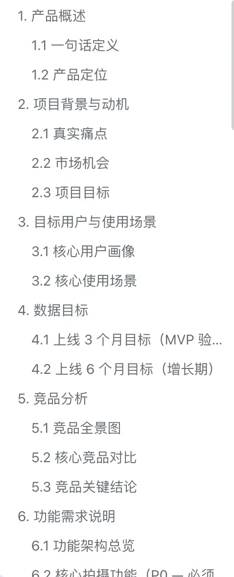 我打开AI,跟它聊了大概20分钟,把我想做什么、核心功能是啥、目标用户是谁、竞品有哪些,全梳理了一遍。AI帮我整理成了一份还挺像样的PRD(产品需求文档),十几页,连功能优先级都排好了。