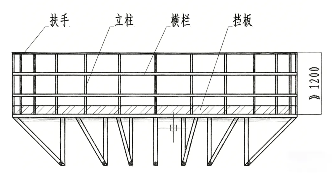 • 扶手采用外径Φ33.5~50mm钢管,立柱采用≥50×50×4角钢或Φ33.5~50mm钢管,立柱间隙宜为1200mm(外直径);