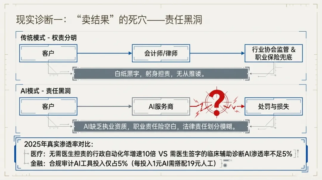 真正的差距不在于勇气,而在于责任的归属——传统服务的责任,有具体的从业者躬身承担;而AI交付结果时,责任主体却模糊难辨,如一团迷雾,无从厘清。
