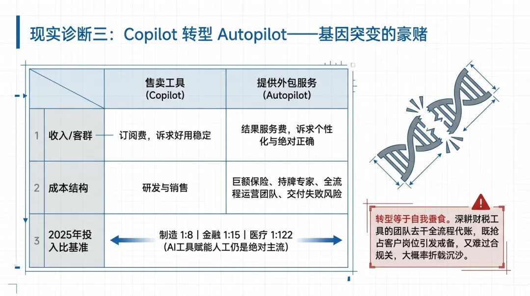 假如一个深耕AI财税工具的团队,原本凭借订阅模式活得风生水起,却一时冲动涉足全流程代账业务,最终很可能导致销售体系彻底混乱——老客户本是购买工具用于自身财务工作,如今服务商却要抢占财务岗位,客户自然心存戒备;新客户的合规要求又难以满足,最终落得两头不讨好的境地,竹篮打水一场空。