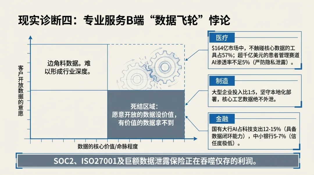 这一逻辑在抖音、淘宝等消费互联网领域,早已被反复验证,屡试不爽。但在B端专业服务领域,却存在一个难以破解的死结:客户对结果的需求越迫切,就越需要向服务商开放核心数据;可核心数据关乎企业命脉,客户的信任门槛便越高,服务商越难获取数据,所谓的数据飞轮,却很难飞的起来。