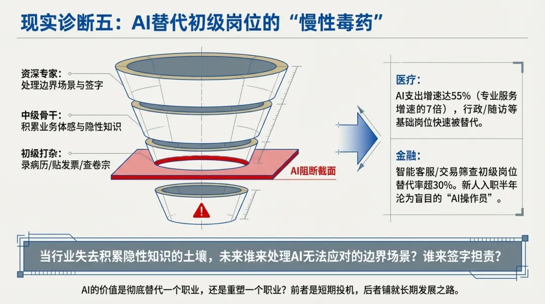 这绝非杞人忧天,2025年的行业数据已显现出明显苗头:医疗行业AI支出增速达55%,是专业服务增速的7倍,行政、随访等基础岗位正被快速替代;金融行业的智能客服、交易筛查等初级岗位,替代率已超30%,不少新人入职半年,甚至未能完整走完一遍业务流程,沦为只会操作AI的“工具人”。