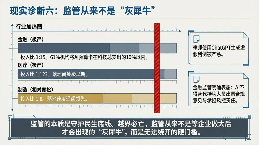 2025年的行业数据,将监管的影响力展现得淋漓尽致:监管最严格的金融行业,AI与人工投入比仅为1:15,61%的金融机构将AI预算控制在科技支出的10%以内,不敢轻易加码;同样强监管的医疗行业,整体投入比达1:122,AI落地尚处早期;唯有监管相对宽松的制造行业,投入比达1:8,AI落地速度遥遥领先,差距不言而喻。