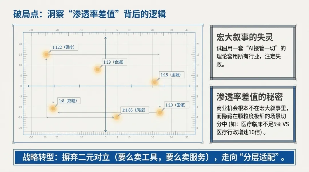 医疗行业中,无需医生担责的行政流程自动化领域,AI市场年增速高达10倍,而需医生签字背书的临床辅助诊断领域,AI渗透率却不足5%,高下立判。