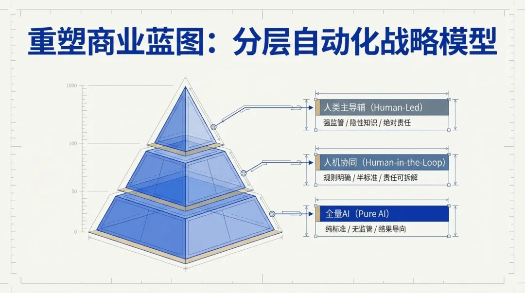 未来的AI服务化,从来不是“要么卖工具、要么卖服务”的二元对立,而是要推行“分层自动化”模式,根据不同场景的特性,灵活适配对应的商业模式,随机应变: