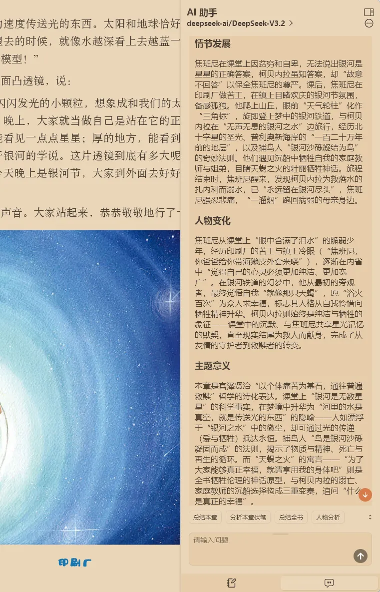 我目前主要 DeepSeek-V3.2,做章节总结、人物性格分析、全书梗概都还不错。尤其读一些信息密度很高的非虚构类书籍时,先让 AI 给个章节摘要,自己再精读,效率提升明显。读经典文学作品时,让 AI 补充一些时代背景和创作语境,理解深度也会不一样。