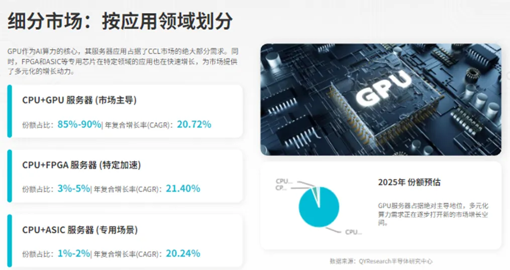 从应用结构看,AI服务器覆铜板需求高度集中在CPU+GPU服务器,这是当前全球AI算力部署的主流架构,也是高端CCL价值最集中的下游场景;CPU+FPGA、CPU+ASIC以及其他专用加速架构构成补充市场。报告显示,CPU+GPU服务器长期占据接近九成的市场价值份额,未来仍将维持绝对主导地位;这说明行业景气度与GPU训练服务器、OAM/UBB板卡、高速背板与交换互连系统的资本开支高度相关。与此同时,随着ASIC推理服务器、定制化AI加速平台和其他异构计算方案逐步扩大部署,非GPU类场景也会保持增长,但短期内仍难改变CPU+GPU架构在需求端的主导格局。整体而言,应用端的本质特征是“需求高度集中,但边际扩散正在发生”。