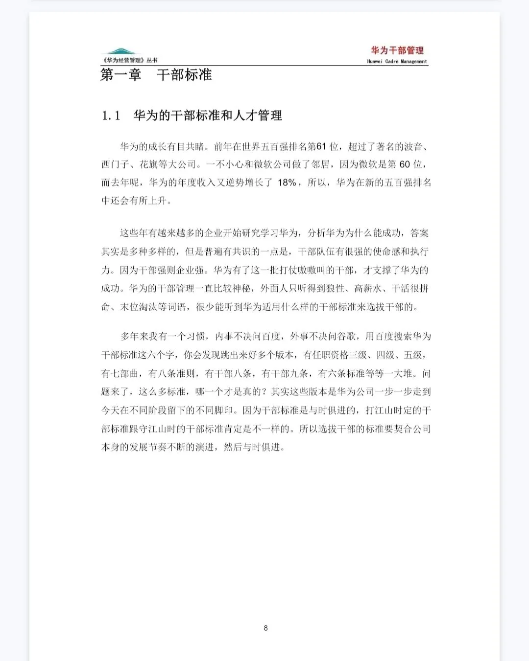华为的成长有目共睹。前年在世界五百强排名第61 位,超过了著名的波音、西门子、花旗等大公司。一不小心和微软公司做了邻居,因为微软是第 60 位,而去年呢,华为的年度收入又逆势增长了 18%,所以,华为在新的五百强排名中还会有所上升。这些年有越来越多的企业开始研究学习华为,分析华为为什么能成功,答案其实是多种多样的,但是普遍有共识的一点是,干部队伍有很强的使命感和执行力。因为干部强则企业强。华为有了这一批打仗嗷嗷叫的干部,才支撑了华为的成功。华为的干部管理一直比较神秘,外面人只听得到狼性、高薪水、干活很拼命、末位淘汰等词语,很少能听到华为适用什么样的干部标准来选拔干部的。