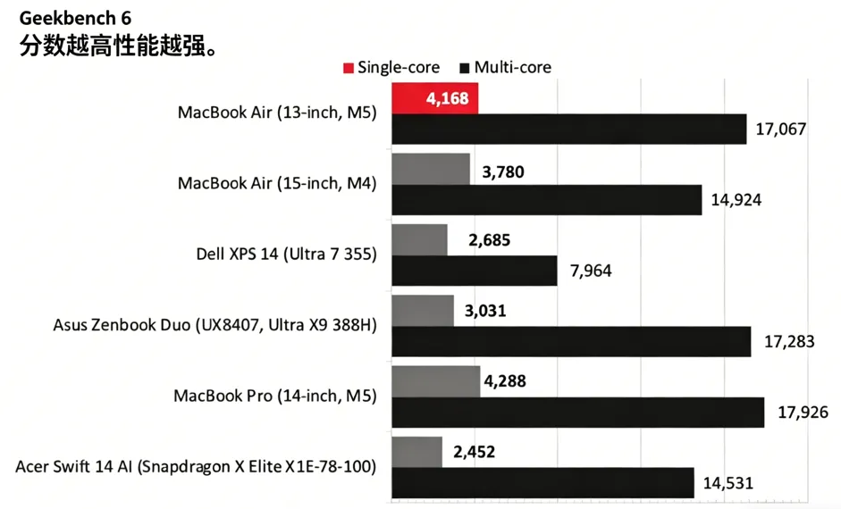 MacBook Air 凭借无风扇设计、卓越做工和持久续航长期霸榜。M5芯片展现强劲单核/多核性能,繁重负载下可能降频,但日常任务游刃有余。若预算有限,可考虑599美元起的 MacBook Neo(性能、接口、背光键盘有所妥协)。