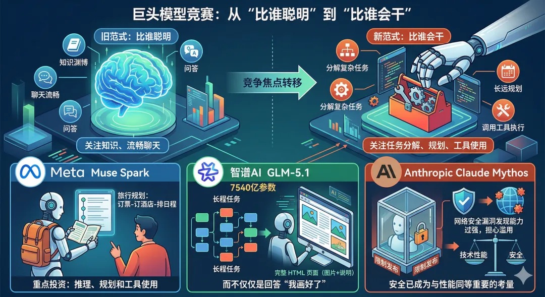 • Meta推出“规划型”新模型:Meta发布了Muse Spark模型,其重点投资方向就是“推理、规划和工具使用”。你可以把它想象成一个不仅知道所有旅行攻略,还能主动帮你把攻略拆解成“订票-订酒店-排日程”等一系列可执行步骤的超级助手。