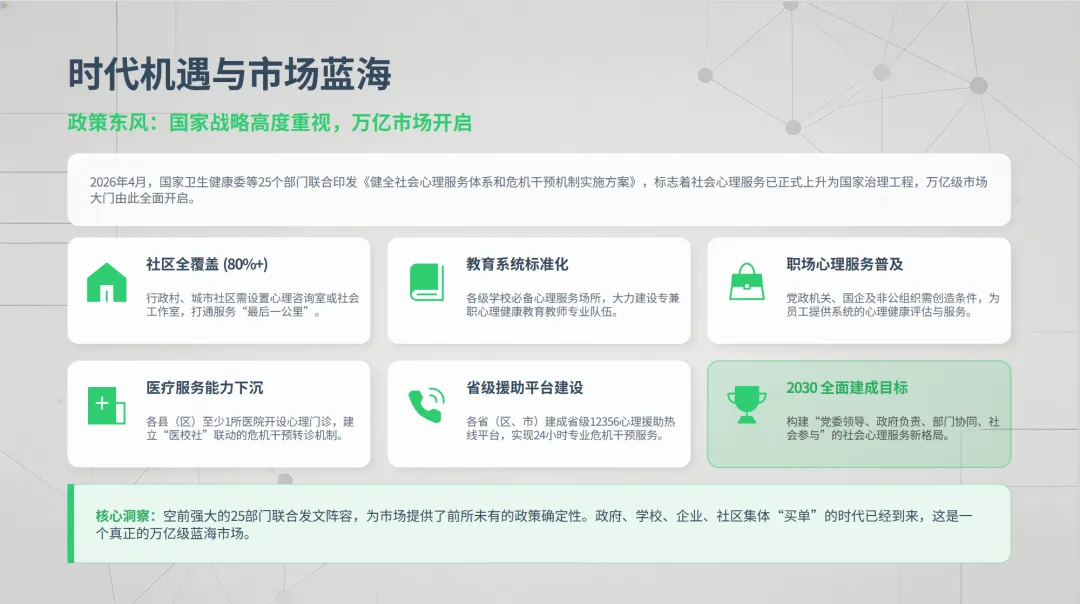 2026 年 4 月,国家卫健委、教育部、公安部、共青团中央等 25 部委联合发文,《健全社会心理服务体系和危机干预机制实施方案》正式落地,直接把校园心理健康推上国家战略级赛道!