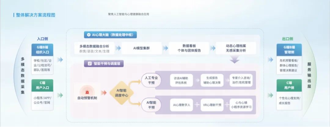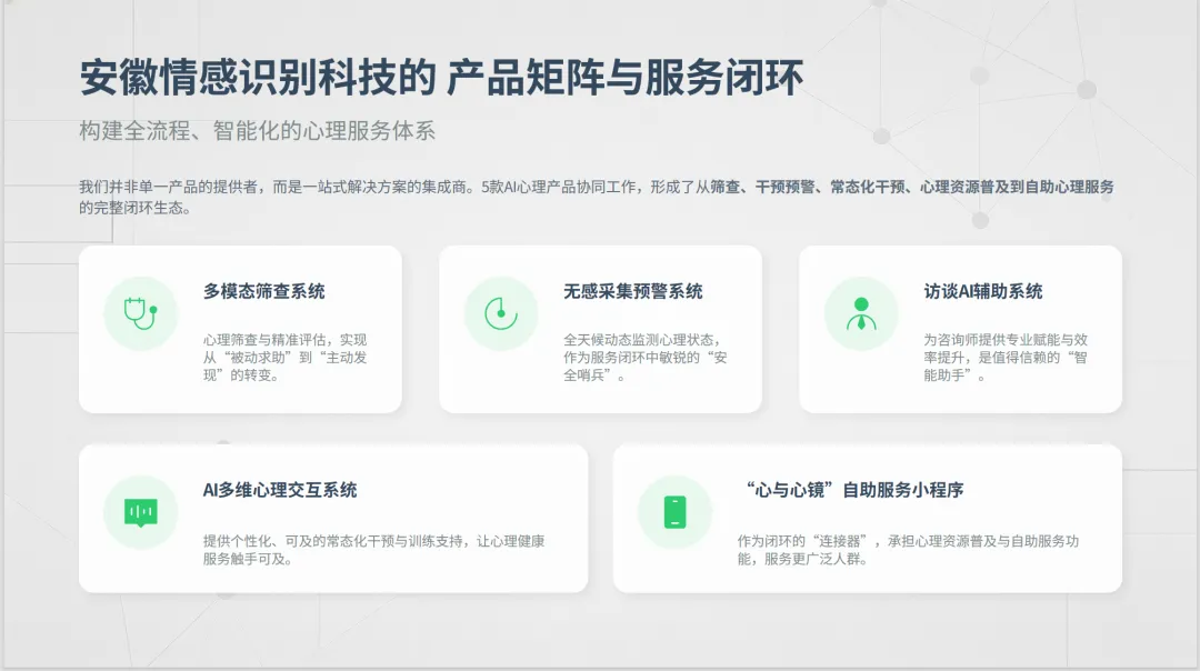 完全对标 25 部委预防 — 预警 — 干预 — 康复核心要求,我们用五大 AI 产品矩阵,打造筛查→监测→干预→普及→自助→管家六位一体智能闭环,从源头防风险、全流程可追溯、全数据打通。
