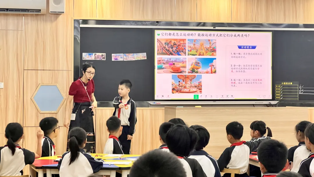 黎晓仪老师执教三年级《平移与旋转》,借助AI 动画技术将抽象概念具象化,学生通过平板拖拽、小组互动操作,直观理解运动本质。AI 系统实时反馈小组作答数据,教师精准点拨、即时调控,真正实现以学定教,课堂高效灵动。