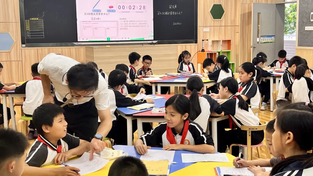 苏凯杰老师执教四年级《买文具》,依托数智平台创设真实购物情境,小组在AI 助教支持下开展探究学习,系统智能推送个性化微课,精准助力不同层次学生突破小数乘整数算理难点,充分展现数智课堂的高效与温度。