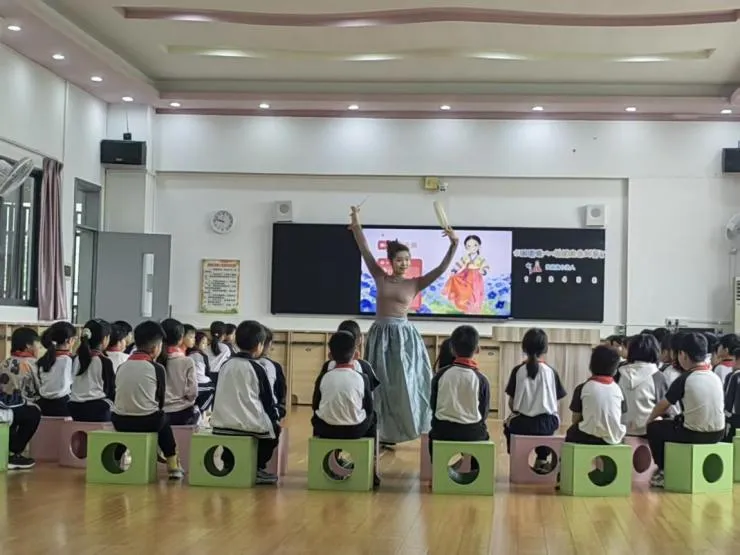 音乐吕允晴老师执教《桔梗谣》,细致讲解朝鲜族舞蹈柔韧舒展、韵律优美的特点,从基础手位、步伐到完整组合逐一示范、耐心纠错,带领学生感受民族文化之美,推动传统艺术在课堂中传承发扬。