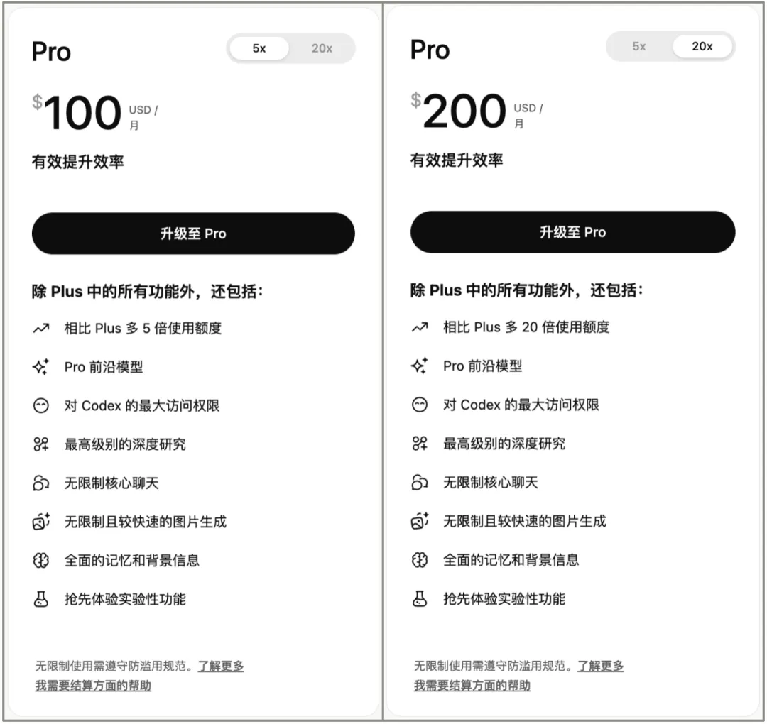 卷了几年,目前AI头部大厂的月费模式逐渐趋同,基本是20刀、100刀、200刀这几个主力档位。