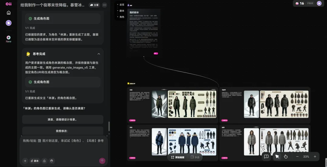 OiiOii 的“AI编剧”就会帮你扩写剧情,“AI分镜师”会帮你拆解0-5秒、5-10秒的镜头,“AI美术总监”会统一人物风格(比如让猫咪保持极简黑白线稿风,其中一只戴着牛仔帽)。