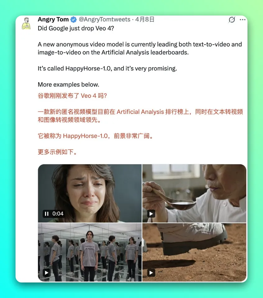 目前 HappyHorse 已开通官方微博 @HappyHorse_AI,官宣仍在内测阶段,网传 “官网” 均为非官方渠道,近期将开放 API,正式与大众见面指日可待。