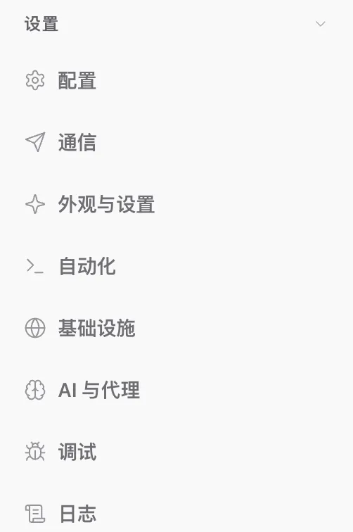 | 菜单 | 功能 | 什么时候用 ||------|------|-----------|| 💬 聊天 | 和AI对话 | 日常使用,让AI帮你干活 || 🎛️ 控制 | 管理渠道、技能、记忆 | 需要添加功能或查看状态时 || 🤖 代理 | 管理AI角色 | 需要不同AI身份时 || ⚙️ 设置 | 配置参数 | 需要调整模型或密钥时 |