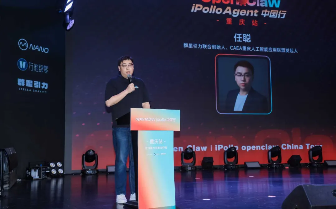 任聪群星引力联合创始人、CAEA 重庆人工智能应用联盟发起人作为重庆本地 AI 生态的核心推动者,任聪代表本地主办方与重庆龙虾社致欢迎辞。他首先感谢全国大咖齐聚山城、赋能西南,并分享了重庆 AI 生态的快速发展与 OpenClaw 在本地的普及热潮。