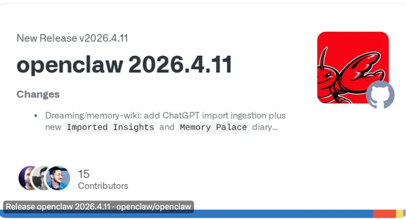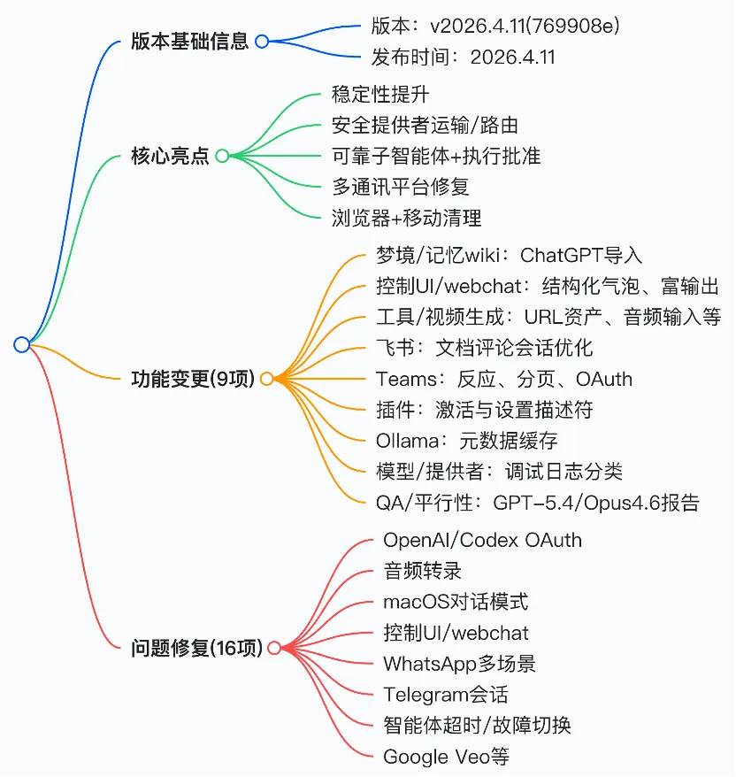 编者摘要:OpenClaw 于2026 年4 月11 日发布v2026.4.11 版本,本次更新以稳定性、安全性、智能体可靠性为核心,同时完成多平台修复与浏览器、移动端界面清理。功能方面新增梦境/ 记忆Wiki 的ChatGPT 导入、记忆宫殿日记选项卡;优化控制UI 与网页聊天,支持结构化气泡与富输出;视频生成模块新增URL 资产、参考音频输入、自适应比例等能力。飞书、Microsoft Teams 交互体验升级,插件支持自定义描述符,Ollama 缓存模型元数据,模型调试日志更易排查问题,新增GPT-5.4 与Opus 4.6 智能体平行测试能力。修复程序覆盖16 项关键问题,包括OpenAI/Codex OAuth 授权、音频转录、macOS 麦克风权限、WhatsApp 消息反应与图像附件、Telegram 会话、Google Veo 生成、智能体超时与故障切换等,全面提升系统兼容性与运行稳定性。