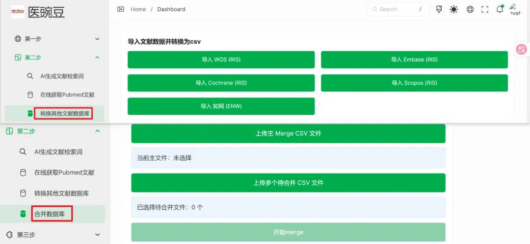 3. 一键实现 WOS、Embase、Cochrane、Scopus、CNKI等主流数据库列表转化与去重合并。