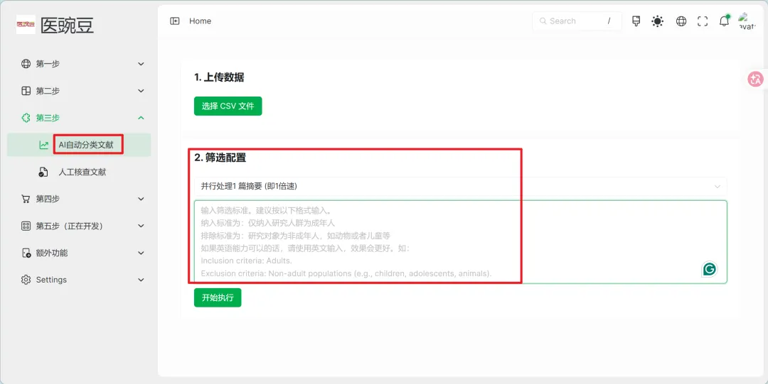 4. AI分类文献:通过我们定义的纳排标准针对每篇文章的摘要进行分类(预计2000篇文献/5min)。