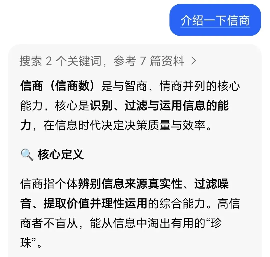 尽信AI不如不用AI你知道现在AI时代,非常稀缺的能力是什么吗?不是编程,不是数据分析,甚至不是AI工具的使用能力。什么是信商?我给它下的定义是,在AI生成内容爆炸的时代,你辨别信息真伪、判断信息价值的能力。现在这个时代,AI生成的内容越来越多,质量越来越高,越来越难分辨是AI写的还是人写的。但是问题来了,AI能生成内容,但它不能保证内容的真实性。你给AI一个错误的数字,它能给你编出一整套逻辑自洽的分析。你给AI一个不存在的研究结论,它能给你生成一堆引用文献,而且这些文献看起来还挺像回事。以前我们说互联网时代的信息辨别是"尽信书不如无书"。现在AI时代,这句话要升级了,变成"尽信AI不如无AI"。为什么我特别强调这个?因为我发现很多人在用AI的时候,完全放弃了独立判断的能力。AI说什么就信什么,AI生成什么就用什么。AI是一个工具,工具是用来服务的,不是用来崇拜的。你用Word写文章,你会相信Word自动给你加的那个逗号一定是对的?你用Excel做表格,你会相信Excel自动填充的数据一定是真的?我不是说AI生成的东西不能用。AI生成的东西,大部分时候是对的,是好用的,是能提效的。但是,你不能因为AI生成的东西"大部分时候是对的",就放弃了辨别真伪的能力。就像你不能因为大部分医生都是好医生,就不看诊断报告直接签字做手术。AI时代,信息辨别能力,不是变简单了,是变复杂了。因为AI生成的内容,天然具有一种"看起来很对"的气质。它语法正确,逻辑自洽,引用规范。但是,这不代表它是真实的。所以,我真心建议大家,在用AI的时候,保留一份警惕心。这个警惕心不是怀疑一切,是保持独立判断。AI给你一个结论,你先想想这个结论跟你的常识对不对得上。AI给你一个数据,你想想这个数据从哪来的。AI给你一个建议,你想想这个建议有没有遗漏什么你知道的因素。在AI时代,信商可能是你最重要的能力。因为AI能帮你做很多事,但它不能替你判断。02