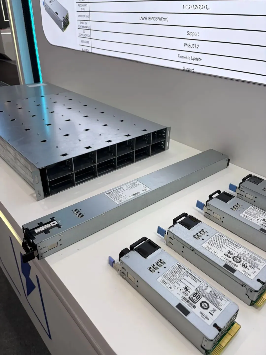 现场展示的模块化电源 shelf 系统,采用标准化19英寸机架设计,支持多模块并联扩容,输出接口丰富,可灵活适配不同服务器集群的供电需求。