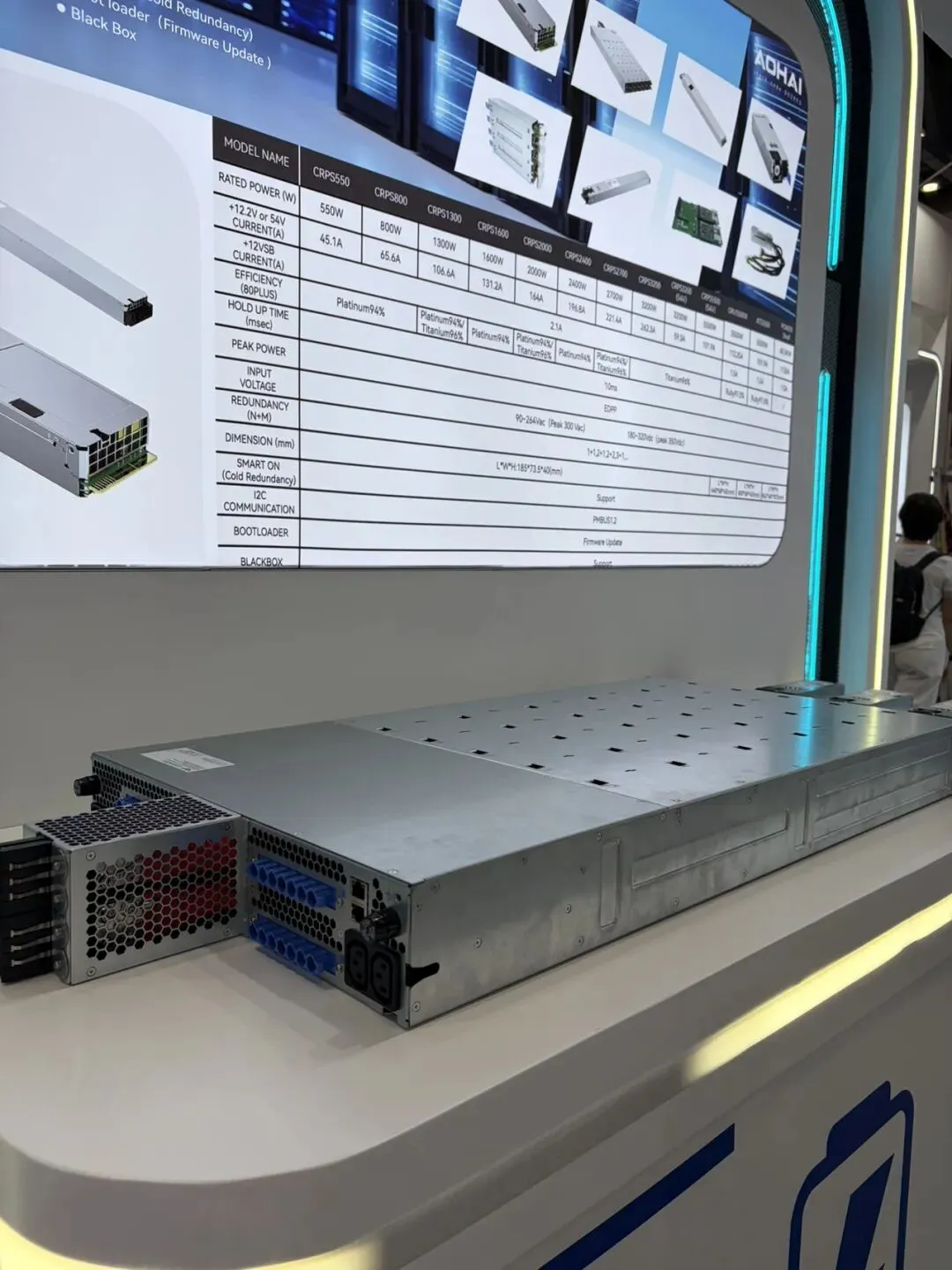 除此之外,本次展出的产品还包括CRPS系列模块化电源,覆盖550W至3200W全功率段,最高支持钛金96%能效,同时推出ATS5500等大功率机架式供电系统,最大输出功率达60.5KW,可满足AI数据中心、高性能计算等场景的高算力供电需求。
