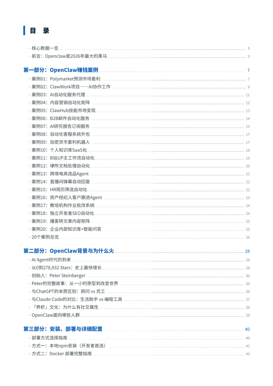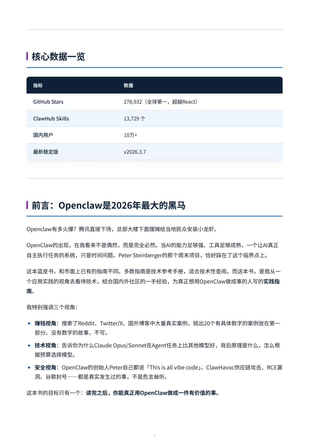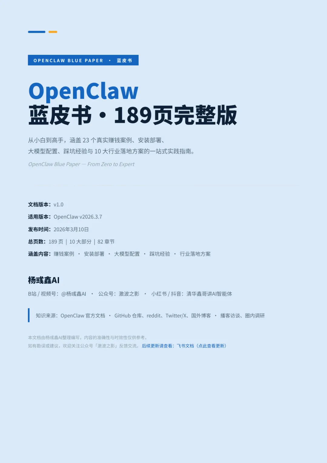 2026年OpenClaw蓝皮书-杨彧鑫AIOpenClaw 作为 2026 年 AI Agent 领域的现象级开源项目,凭借极快的增长速度与实用落地能力,成为 AI 自动化与变现的核心工具,这份 189 页蓝皮书从实战、技术、安全、行业落地等维度,提供了从入门到精通的完整指南。 蓝皮书以实战为核心,兼顾技术与安全,是个人与企业借助 AI Agent 实现效率提升、商业变现的实用手册,助力从业者抓住 AI Agent 时代的变革机遇。 ————