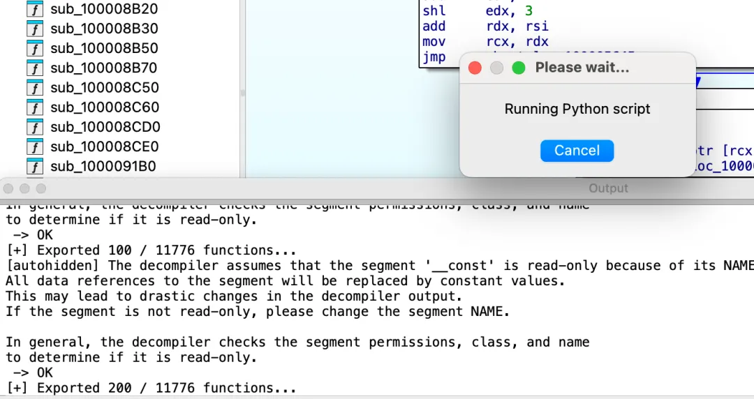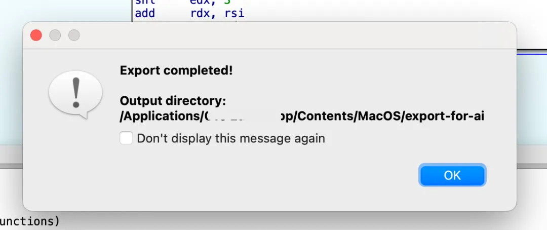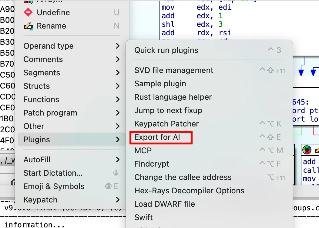 在 IDA 中通过快捷键 Ctrl-Shift-E 或菜单栏 Edit -> Plugins -> Export for AI 启动导出。