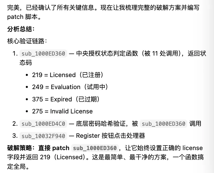 今天,我们还需要给它配上专属的 Skill 当‘外脑’,还需要手动导出 IDA 数据来‘喂饭’才能完成破解。但谁知道呢?也许就在明天,某次大模型迭代之后,它原生的能力就能直接平推这一切。未来的逆向,或许真的只剩下一句 Prompt 的事了。
