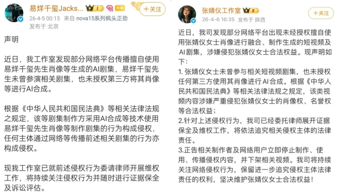 2026年4月,一场声势浩大的艺人集体维权潮将AI短剧行业推至舆论的风口浪尖。易烊千玺、张婧仪、龚俊、邓为工作室接连发布抵制AI短剧侵权声明,称部分网络平台未经授权擅自使用其肖像,制作和传播AI剧集,要求停止侵权并下架相关视频。