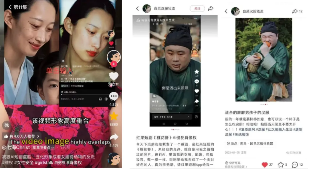 事实上,这场"盗脸"维权潮并非只针对艺人,普通人早已深受"盗脸"侵权的困扰。在此之前,两名网友"白菜汉服妆造"和"七海Christ"先后发文,称自己在网上发布的照片被AI短剧《桃花簪》擅自抓取复刻,生成恶意丑化的角色。