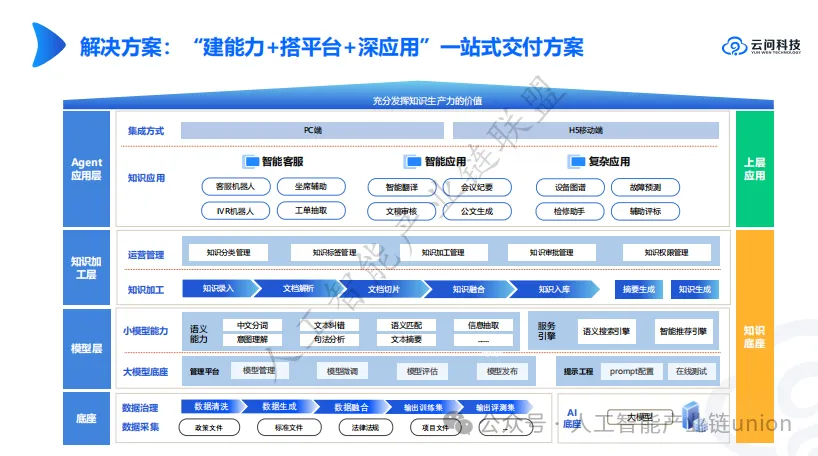 云问科技提出“建能力+搭平台+深应用”的一站式交付方案,涵盖从底层模型到上层应用的全链条构建,确保企业快速落地智能化客服系统。