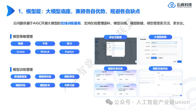 云问提供基于AIGC开源大模型的在线训练服务,支持企业在线管理语料、训练模型、调试优化。模型层设计兼顾开源模型的灵活性与企业数据的安全性,帮助企业构建专属的AI能力。