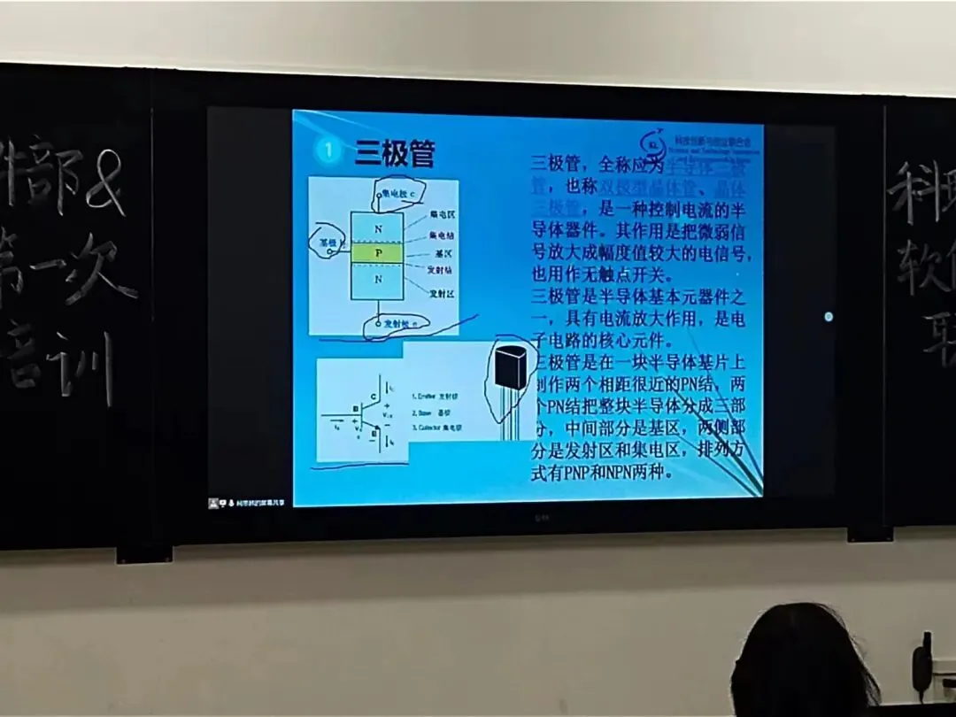 柯思林同学首先对电源模块、杜邦线、三极管、LED、电阻、电容以及面包板进行介绍,其次讲解了电源正负极、二极管、三极管、轻触开关以及晶振的具体作用与使用方法。其中,重点讲解了三极管的作用、使用方法及其对应的电路连接图。