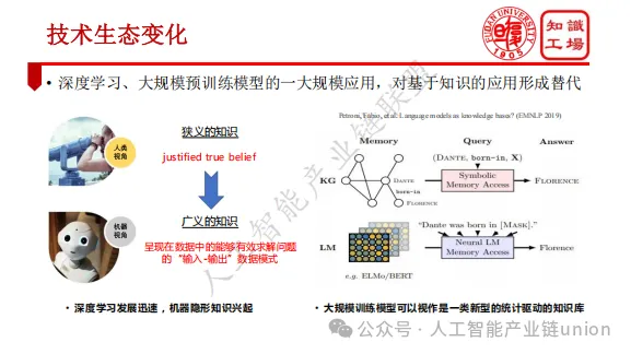 近年来,深度学习、大规模预训练模型的大规模应用,对基于知识的应用形成了替代与补充。大规模训练模型可以被视作一类新型的统计驱动的知识库,机器隐性知识正在兴起。