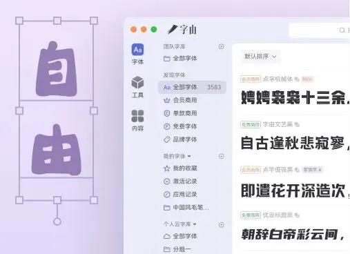 1、字由客户端本身免费,但字体商用需用户自行联系字体厂商获取授权。软件目前有上千款字体,主要来自设计师分享,以简繁中文字体为主,未来会加入拉丁、日韩字体。目前只支持单机使用,团队协作功能会在后续版本推出。