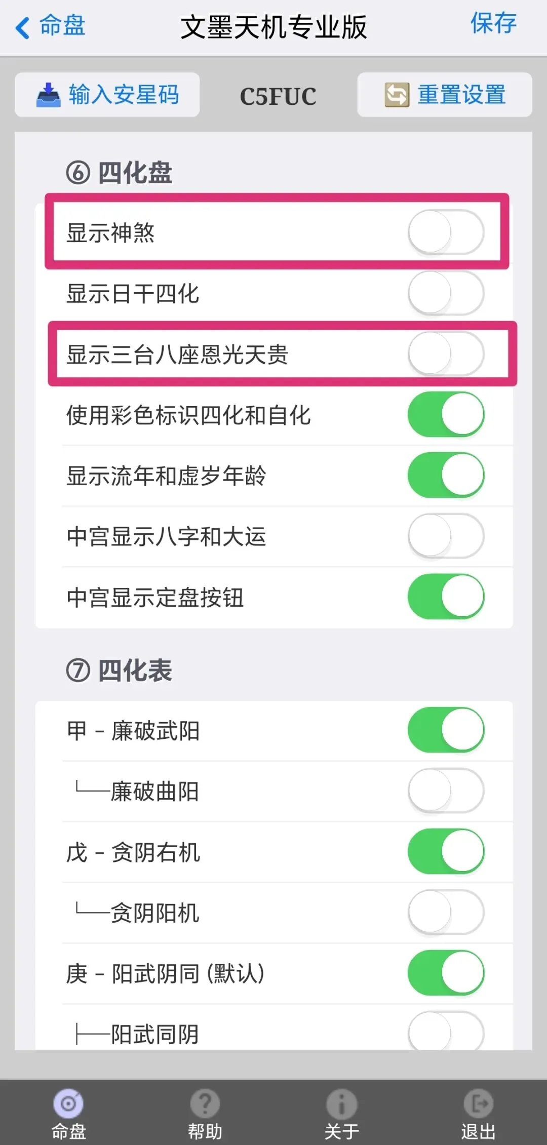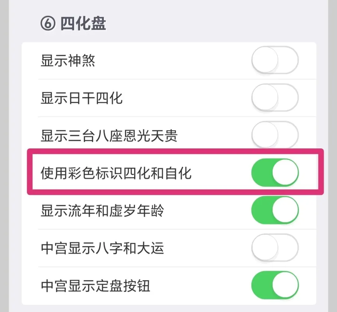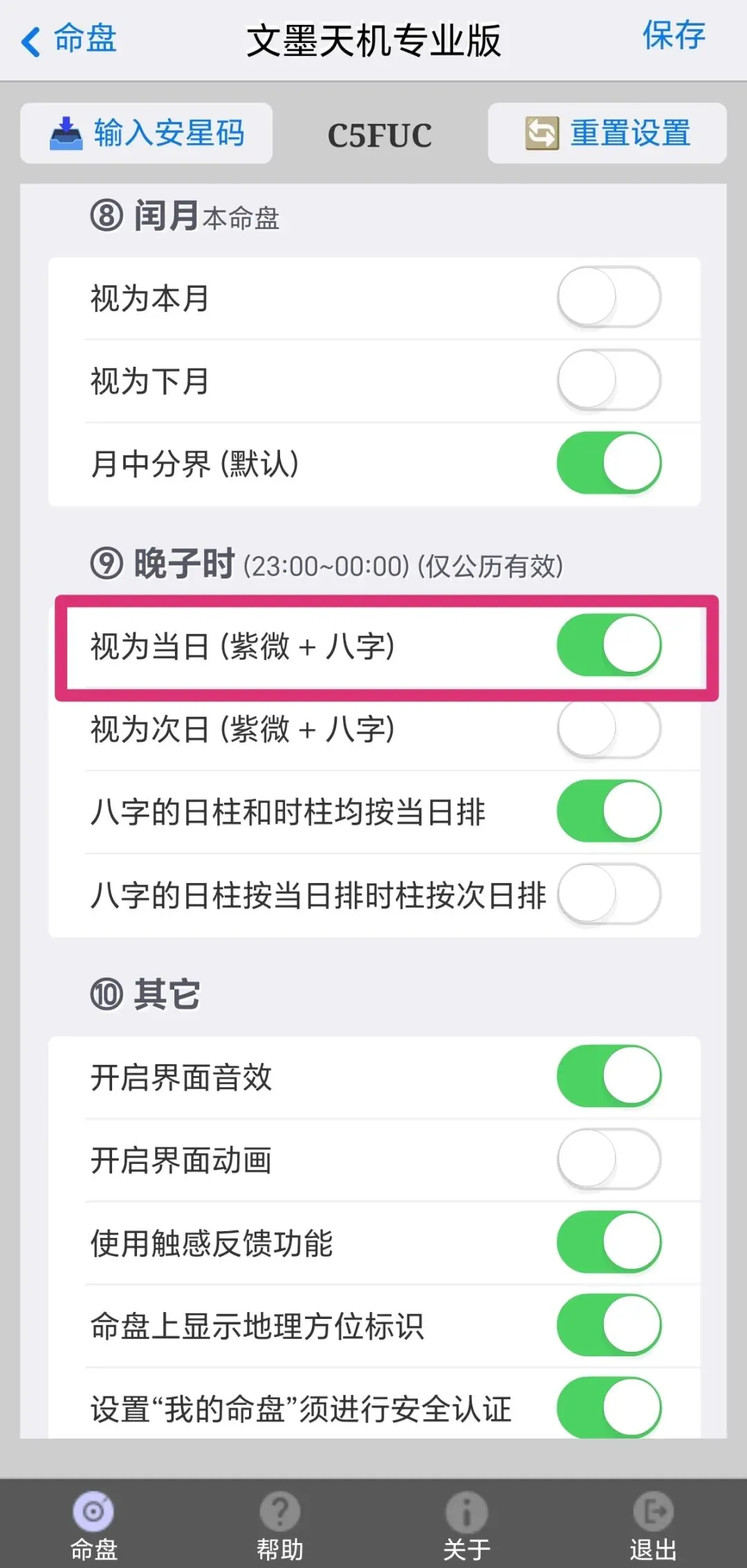 我主要用四化,第9项“晚子时”我用的子正换日,所以需要把晚子时项下“视为当日”这个按钮拉绿。然后保存,退出。
