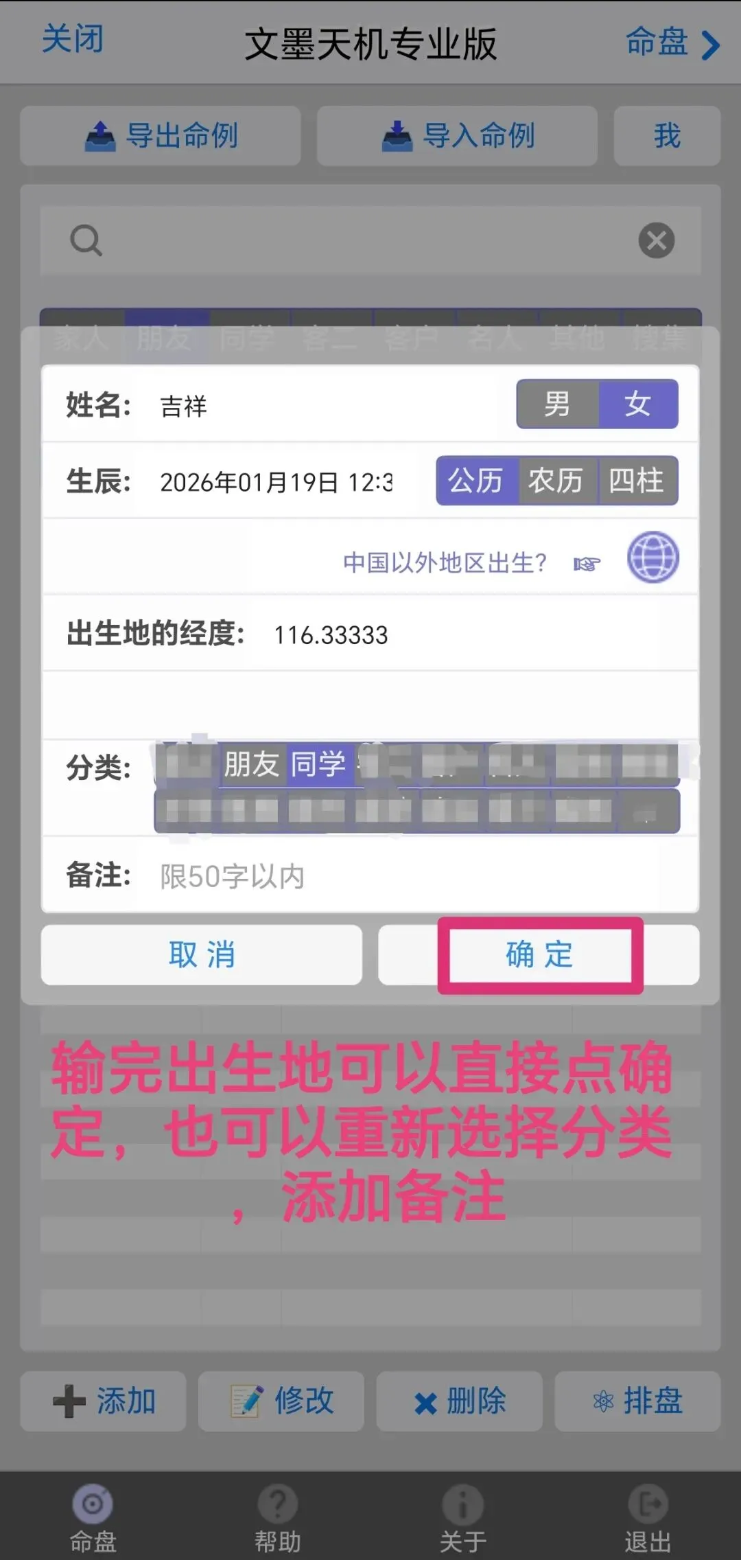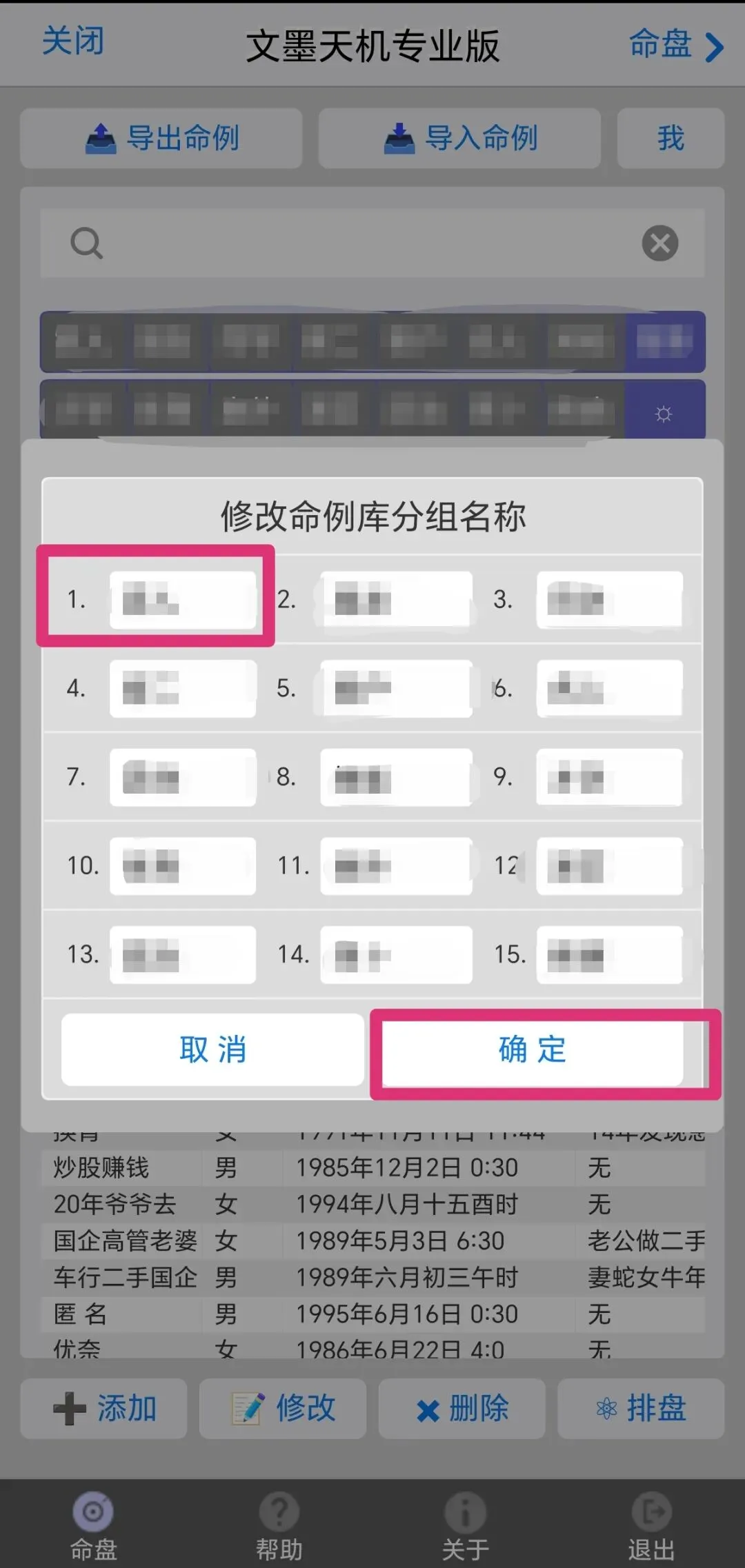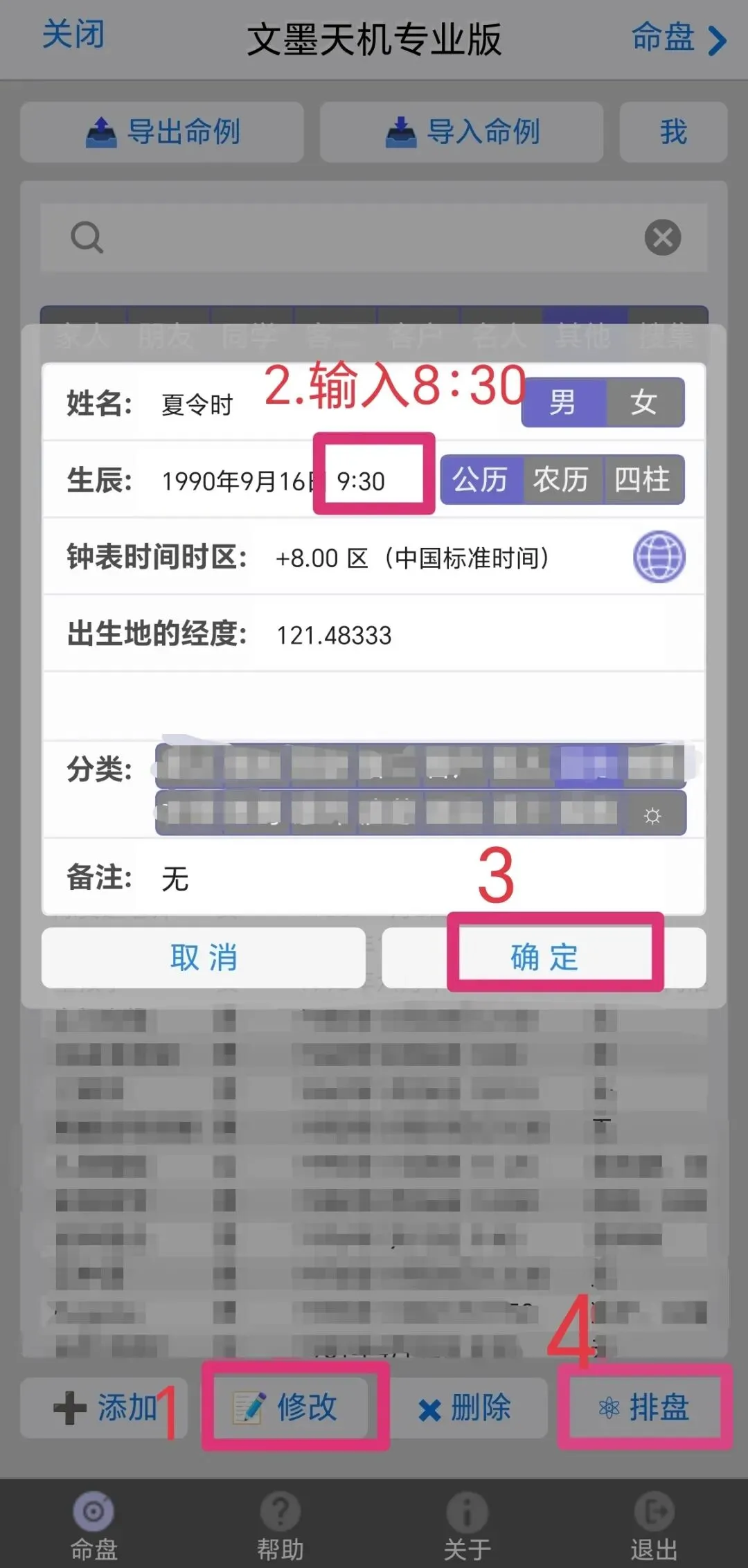 点击确定,再点击命例,在命理分组里面找到该条记录,点击,再点击“修改”排盘,出生时间手动减1小时输入,依次输入相关信息,排盘即可。